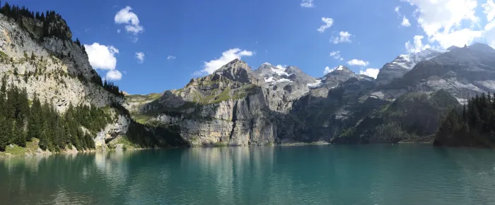 Lake Oeschinen is often described as one of the most beautiful alpine lakes in Europe. Its deep blue waters sit beneath towering cliffs, creating a striking contrast of colors.