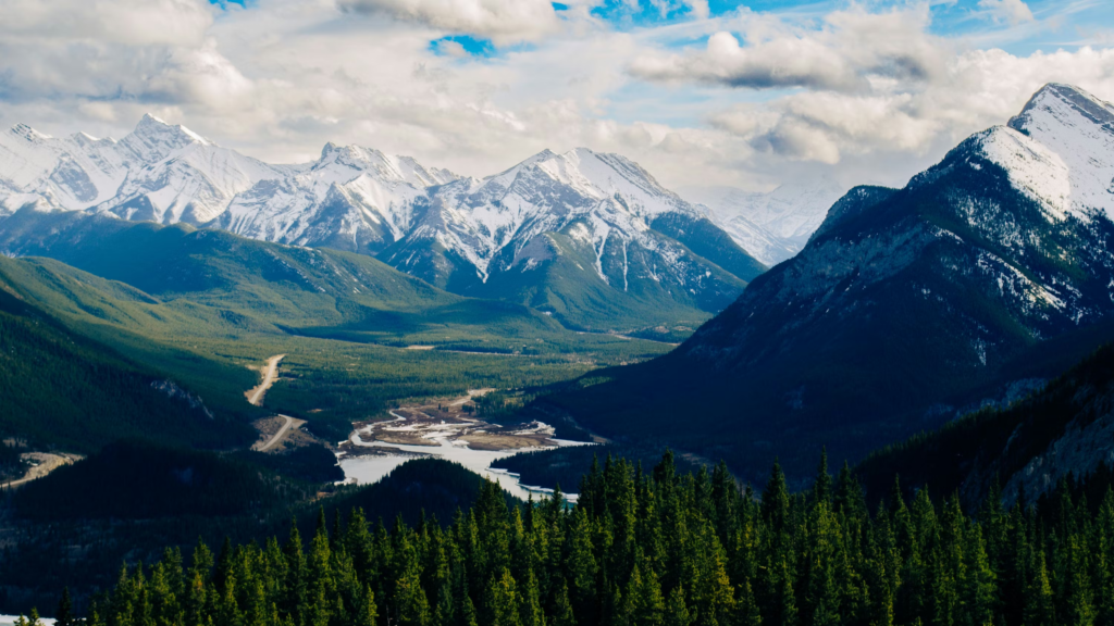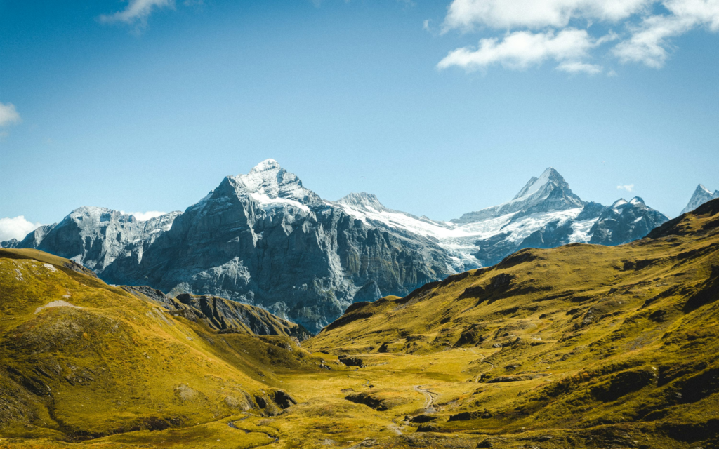 - Snow-covered peaks and green valleys